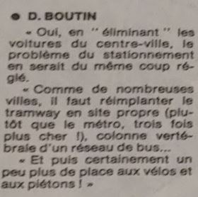 En 1989, autour de la matrice de plusieurs associations locales, émerge une première candidature écologiste aux municipales. Les verts seront alors les premiers à évoquer un projet fou : une ligne de tram. Dingue. Mais ils poseront aussi la question de l’organisation de la circulation et celle des parkings relais pour désengorger un centre de plus en plus pollué et saturé. Même la NR se saisit du problème, proposant des photos-reportages faisant état de l’emprise de la bagnole en ville, grignotant trottoirs et espace public, allant même jusqu’à réclamer une « plus forte pénalisation du stationnement interdit ». De l’histoire ancienne, si l’on compare à aujourd’hui et à la figure victimaire de l’automobiliste conspué, moqué, vulnérable vache à lait d’un complot bourgeois-bohème pour lui facturer son stationnement coupable à prix d’or. Les socialistes, peu intéressés par ces questions à l’époque, parlent par la voix de Jean Germain d’un « métro léger de surface de la Tranchée à Trousseau », alors que Royer qui « préfère les citoyens planteurs d’arbres aux citoyens écologistes » promet de construire 3 000 places de parking en sus, regrettant tout de même le bon vieux temps, celui où « il n’y avait pas des nuées d’écologistes qui vous tombent dessus comme des moustiques qui piquent ». Même le FN qui présente une liste pour la première fois parle « d’environnement ».