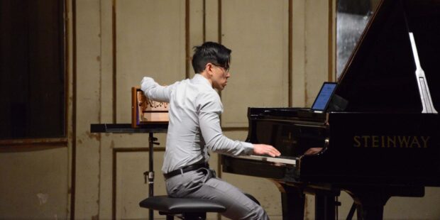 Ensuite Gabriel Pierné (1863-1937), compositeur français, dont l’Étude de concert op. 52 fût brillamment interprétée par Andrew Zhou. Suivi par « Transcendental Etude » de la compositrice australienne Liza Lim (1966- ). Une pièce très originale, composée en 2022, en création française pour piano et « shruti box », petit instrument indien produisant des sons proches de l’accordéon, que le pianiste actionne de sa main gauche pour accompagner sa main droite au clavier.