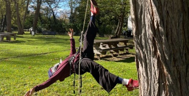 Répétition de danse suspendue : une des composantes du spectacle, qui mêle jeu, projection et performances aériennes – photo Arbre Compagnie