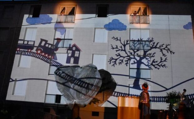 Projection sur façade, comédiens aux fenêtres et jeu au sol : le spectacle investit l’immeuble et transforme le quartier de Chautemps en scène à ciel ouvert – photo Arbre Compagnie