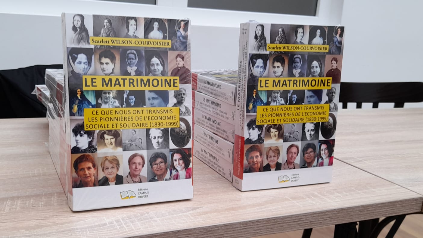 Il était possible de se procurer sur place l’ouvrage Matrimoine : ce que nous ont transmis les pionnières de l’ESS (1830-1999) de Scarlett Wilson-Courvoisier. Crédit : CG.