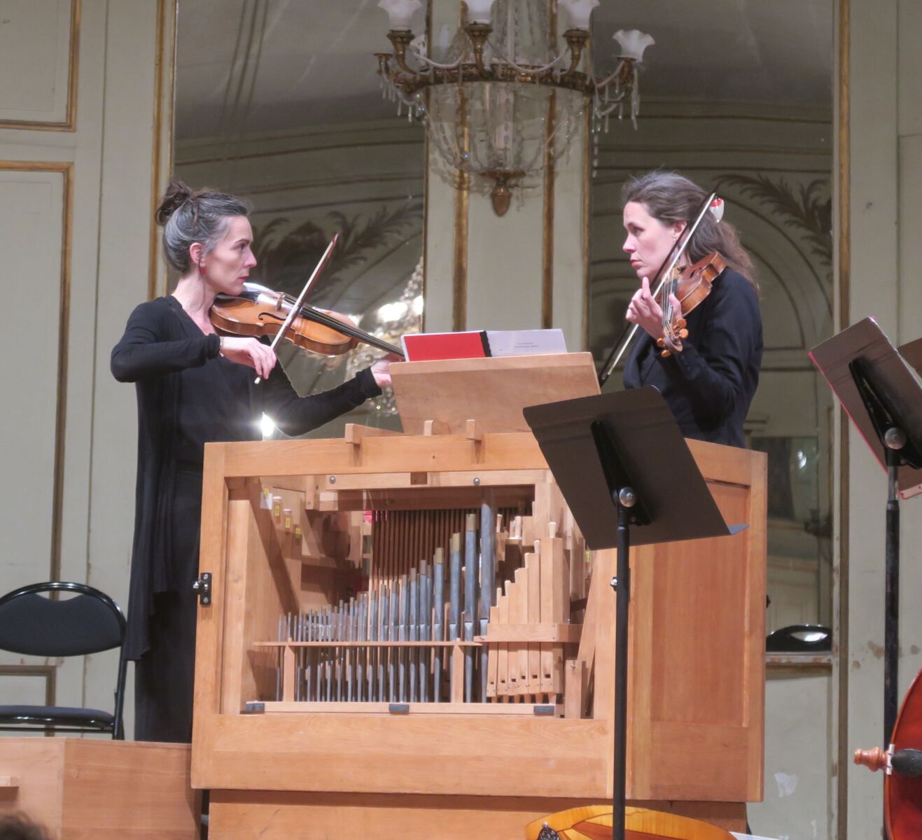 Josèphe Cottet et Marie Rouquié, violonistes, s’accordent avant le concert. Photo AC Chapuis