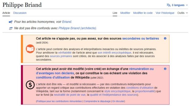 Même l’espace numérique et les Internets sont l’objet de la volonté de contrôle du magnat. Par exemple, la page Wikipédia de Philippe Briand affiche carrément une en-tête où il est précisé aux lecteurs de se méfier du contenu. Pourquoi ? Car des rédacteurs de la notice auraient été rémunérés, ce qui est formellement interdit par l’encyclopédie collaborative. Renseignement pris, il apparaît que plusieurs de ces rédacteurs sous pseudo qui procédaient à des modifications positives de la page de Briand et qui ont été bannis de Wikipédia en juillet 2022 officiaient directement depuis… le siège d’Arche.