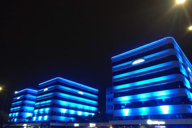 Et tout ça, c’est la partie émergée de l’iceberg. Car il y a aussi un bon nombre de bâtiments propriété directe du groupe qui les loue pour en faire des bureaux, par exemple autour de la gare de Tours, un espace stratégique à « une heure de Paris ». Mais le paroxysme de cette emprise urbaine, c’est le Champ-Girault qui l’incarne le mieux. Cet ensemble d’édifices datant des années 1970 est grignoté par Arche depuis des années pour y regrouper les différentes composantes de l’empire : Saint-Pierre Assurances, Belvia garanties, Snexi états des lieux&diagnostic, API conseil et financement, la conciergerie Cousin Hub’, Arche talents et formation, Q1C1 système d’informations, Naxos solutions digitales, Référence communication-marketing-événementiel, MyLegiTech contract lifecycle management, ISH conseil au secteur public local, Sphère Immo Neuf courtage en immobilier, ParuVendu, BienIci, Le Bon Agent, Square Habitat… une vingtaine de boîtes en tout. Signe de l’emprise, là aussi, le choix d’inonder le Champ-Girault d’une signature lumineuse « corporate », donnant l’impression que c’est Arche qui décore suivant ses goûts le quartier, quartier du reste hautement symbolique et marqué par les signes du pouvoir public : cité administrative, tribunal de commerce, directions de la Préfecture, CAF, CPAM, URSSAF, Finances Publiques… Et dans le nano-Manhattan turon, c’est clairement Briand qui a pris le dessus et qui choisit donc le dress-code urbain en fonction de son humeur et des messages subliminaux à faire passer. Bleu-violet presque tout le temps, rose le 8 mars.