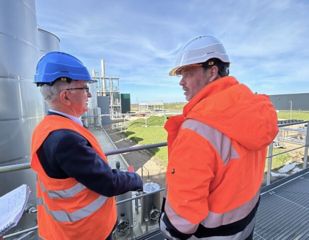 En visite sur le site de la nouvelle unité de transformation de Baule (Loiret), Alexis Duval, cofondateur d’Intact, explique les installations du centre innovant au président de région François Bonneau. Photo Estelle Boutheloup.