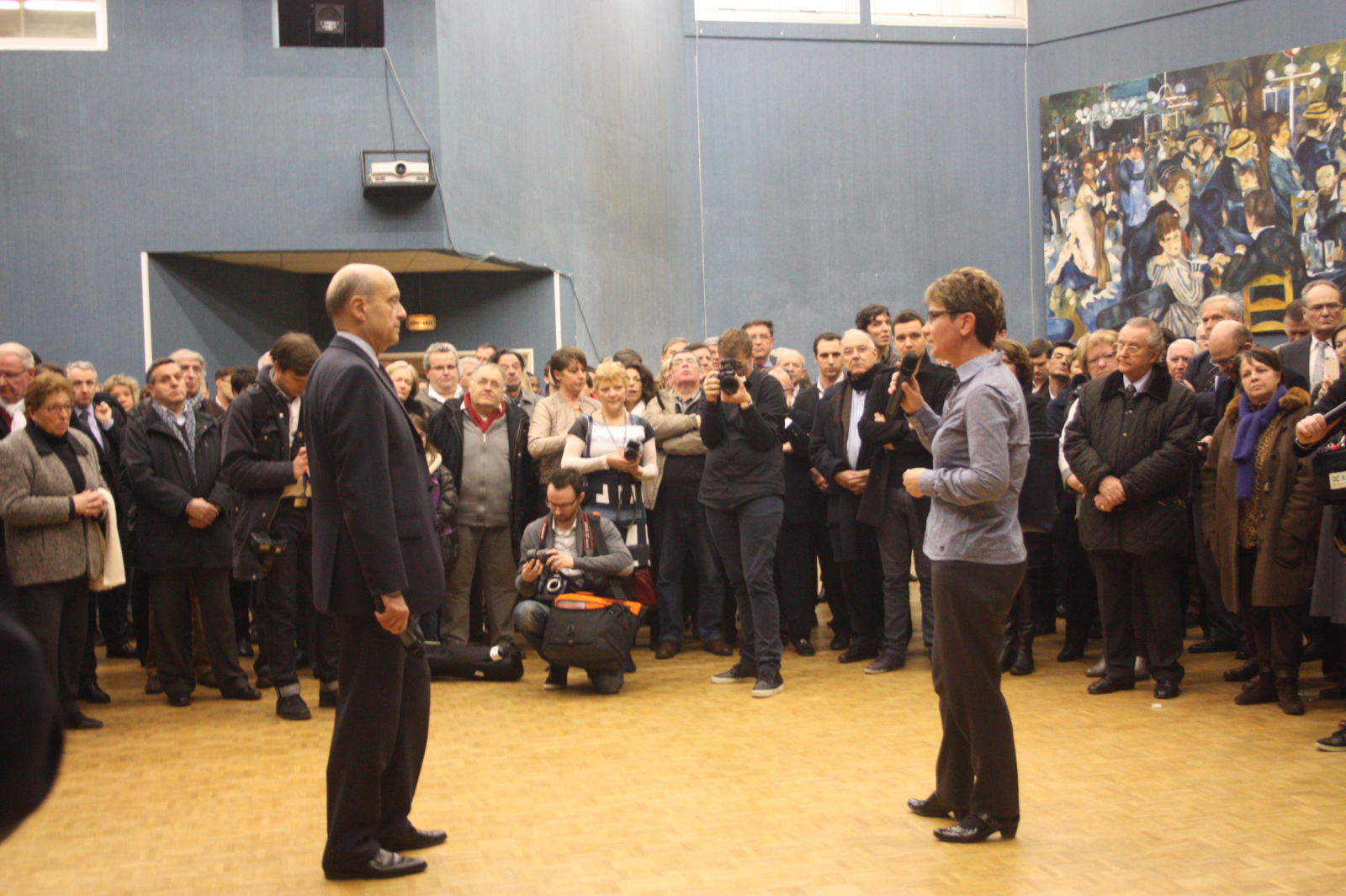 Alain Juppé en dialogue avec une militante à Olivet (Loiret).