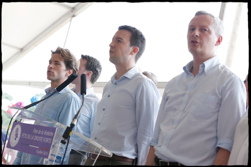Guillaume Peltier et Geoffroy Didier côte à côte à la fête de la Violette 2013, ici avec Bruno Le Maire.