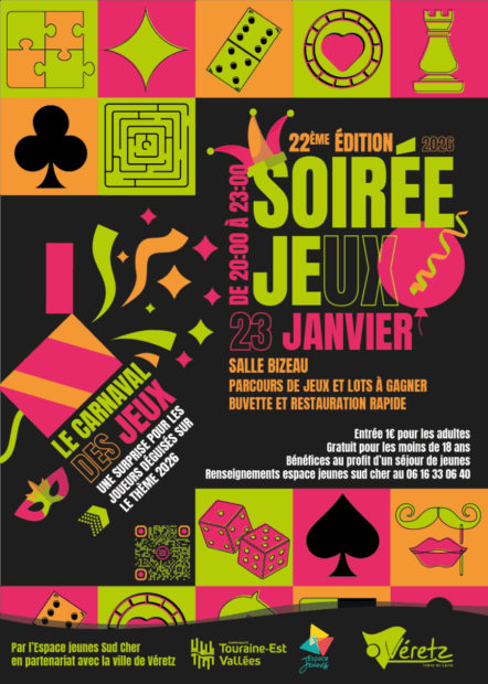 L’Espace Jeunes Sud Cher, en partenariat avec la Communauté de communes Touraine-Est Vallées (TEV) et la ville de Véretz, organise sa 22ᵉ Soirée Jeux le vendredi 23 janvier 2026, de 20h à 23h, à la salle Bizeau.