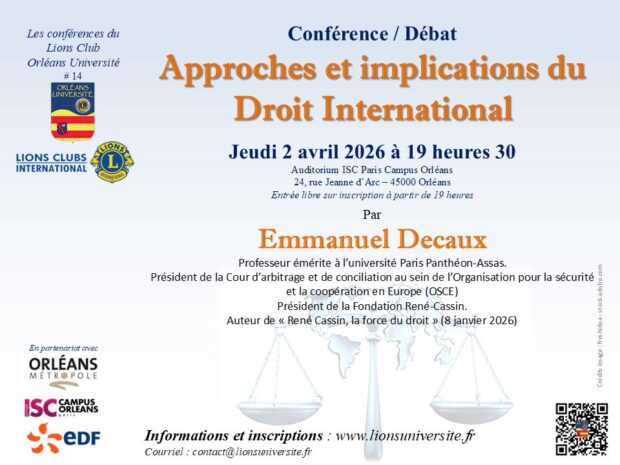 aussi le Club Orléans Université qui organise chaque année depuis 2011 une conférence sur des sujets sociétaux, notamment celle de 2021 “L’humanisme d’aujourd’hui et de demain” a-t-il choisi le DROIT INTERNATIONAL pour cette année 2026