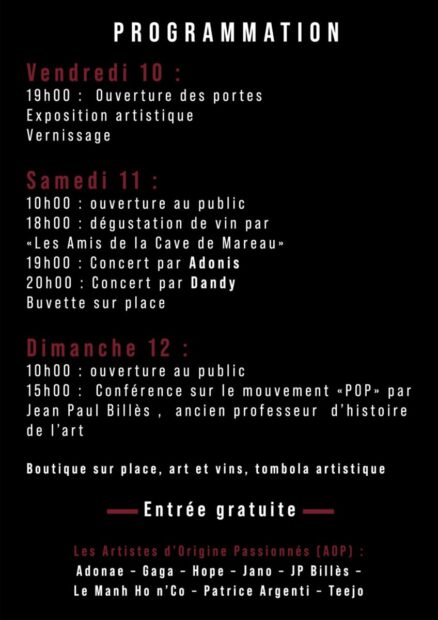 Pour parfaire cette atmosphère, les journée seront rythmée par deux concerts et d’une dégustation des vins du terroir et une conférence sur sur le mouvement pop.