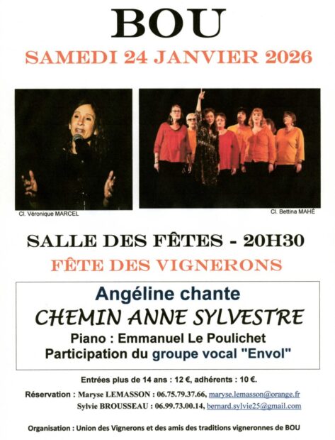 La traditionnelle Fête des vignerons de Bou se déroulera les 24 et 25 janvier prochains. Comme à l’habitude, elle donnera lieu à un concert de Chanson française le samedi soir Cette année, l’Union des vignerons de Bou accueille une interprète locale, Angéline avec un spectacle qu’elle a créé en 2024 en hommage à Anne Sylvestre. « Chemin Anne Sylvestre » c’est une promenade entre deux écritures. Ses chansons, mes chansons… un itinéraire possible, une voie qui s’ouvre, un spectacle pour dire merci. » dit l’artiste. Elle est accompagnée au piano par Emmanuel Le Poulichet et le groupe vocal Envol, composé de dix chanteuses orléanaises, participe à cette soirée.
