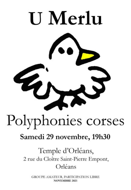 U Merlu est un jeune groupe de polyphonies corses amateur. Les membres du groupe viennent de Tours, Paris, Asquins, Orléans, Bruxelles, et Berlin pour partager avec vous leur joie de chanter ces polyphonies a capella. Leur répertoire est composé de polyphonies corses traditionnelles, profanes, sacrées et de polyphonies contemporaines dont l’histoire ou le sens seront présentés entre les chants.