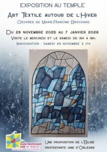 Marie-Francine Brochard utilise des tissus et des fils du commerce, mais aussi des matériaux de récupération, des tissus usagés, ou plus nobles tels que le lin. Elle aime les couleurs, et peint parfois ses tissus. Elle utilise aussi le piqué libre, sorte de broderie réalisée à la machine, mettant en valeur sa création. Au temple, en décembre, elle présentera des pièces évoquant Noël par le thème ou les couleurs et des paysages d’hiver. Quelques patchworks plus traditionnels répondront à des œuvres d’art textile plus originales.