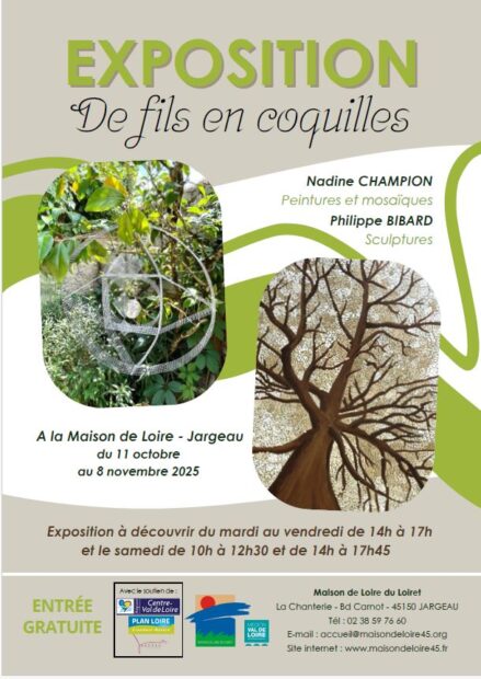Nadine CHAMPION expose ses peintures et mosaïques à base de coquilles d’œufs ; Philippe BIBARD présente ses sculptures en fils de fer tressés.
