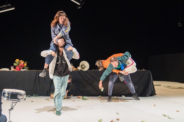 Tables mouvantes, plongeoir bizarroïde, ventilateur géant, planchers incertains, sols à l’envers : chez les Galactiks, le monde devient littéralement instable – voire désaxé. Le moindre geste du quotidien est susceptible d’entraîner une cascade de situations dangereuses. Entre gags et poésie, une petite communauté d’acrobates de la vie cherche à s’extraire d’une machinerie diabolique. S’inspirant de l’effet Coriolis, qui détermine sur Terre la direction des vents, Frasques brouille les frontières : difficile de dire si ce sont les acrobates qui jonglent avec d’étranges dispositifs, ou si ce sont ces objets inertes qui jonglent avec des corps vivants.