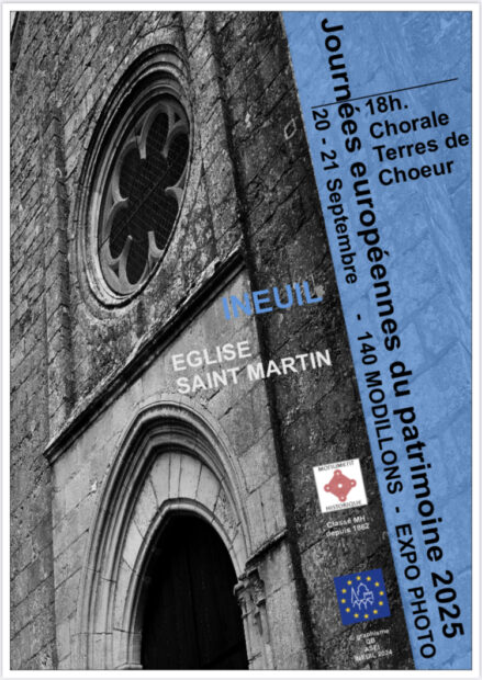 Pour les journées du patrimoine du 20 et 21 septembre 2025, l’église romane d’INEUIL, classée à l’inventaire des monuments historiques, ouvre ses portes et propose une exposition de photographies des 140 MODILLONS qui ornent la corniche de l’église romane et le clocher du XIIe siècle. Un livre regroupant ces mêmes photographies, avec plans et dessins, sera présenté avant son impression. Des Jumelles seront à disposition pour admirer le travail remarquable des sculpteurs.