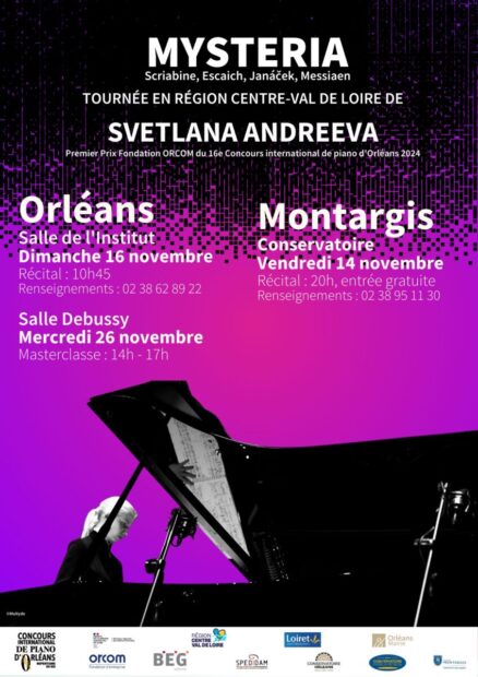 Dans le cadre de la tournée Mysteria en Région Centre-Val de Loire, Svetlana Andreeva, lauréate du Premier Prix Fondation ORCOM lors du 16e Concours international de piano d’Orléans, proposera : le vendredi 14 novembre un Récital à 20h au conservatoire à Montargis. À travers un programme original allant de la Messe noire à la Messe blanche, en passant par les Litanies de l’ombre, le récital dessine un parcours spirituel entre ténèbres, rédemption et lumière, porté par les œuvres de Scriabine, Janáček et Messiaen.