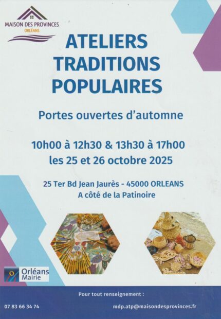 Les Ateliers Traditions Populaires ont le plaisir de vous convier à la Maison des Provinces d’Orléans pour leur week-end portes ouvertes d’automne les samedi 25 et dimanche 26 octobre 2025 de 10h00 à 12h30 et de 13h30 à 17h00.