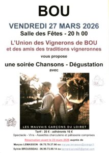 Depuis 2018, l’Union des vignerons et des amis des traditions vigneronnes de Bou, organise le dernier vendredi du mois de mars, un soirée culturelle accompagnée d’une dégustation de vins régionaux. Cette année ce sont les “Mauvais garçons du Loiret” qui animeront cette soirée programmée le 27 mars à 20h à la salle des fêtes.