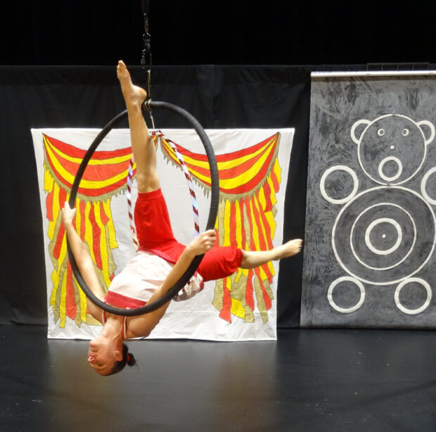 Elle s’exerce, s’amuse, découvre et présente aux jeunes spectateurs, les différentes disciplines du cirque !