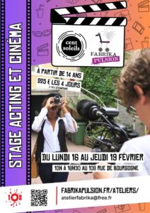 https://ateliers.fabrikapulsion.fr/theatre-enfants-ados/stage-acting-cinema/ ; atelierfabrika@free.fr
