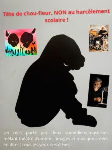 Porté par deux comédiens-musiciens, le récit est présenté sous forme de théâtre d’ombre, dont la mise en image et en musique se fait sous les yeux des élèves. Un dispositif performatif et immersif qui permet de représenter avec poésie la violence d’un sujet brûlant. Nous ne saurons jamais qui se cache derrière la silhouette noire et blanche de la victime (Une fille ? Un garçon ?) afin de permettre une identification totale de la part du public. Chaque représentation est suivie d’un temps d’échange avec les élèves afin de prolonger les réflexions et transmettre les bons réflexes face aux situations de harcèlement.