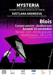 Dans le cadre de la tournée Mysteria en Région Centre-Val de Loire, Svetlana Andreeva, lauréate du Premier Prix Fondation ORCOM lors du 16e Concours international de piano d’Orléans, proposera : le samedi 15 novembre une masterclasse : 14h à 17h un Récital à 11h au Conservatoire Auditorium de Blois. À travers un programme original allant de la Messe noire à la Messe blanche, en passant par les Litanies de l’ombre, le récital dessine un parcours spirituel entre ténèbres, rédemption et lumière, porté par les œuvres de Scriabine, Janáček et Messiaen.