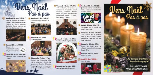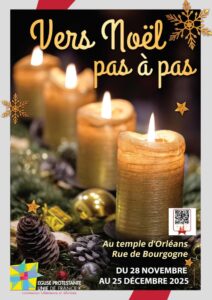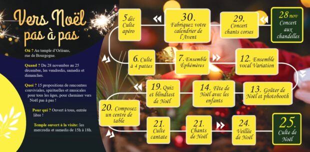 Pour sa cinquième édition, « Vers Noël pas à pas » vous propose 15 rencontres pour cheminer vers Noël pas à pas ! Il y en a pour tous les goûts : des concerts, des ateliers à vivre en famille, un quiz et blindtest de Noël, un goûter avec photobooth, et bien sûr, des moments cultuels pour tous les âges. L’entrée est libre et gratuite ! Les vendredis, samedis et dimanches du 28 novembre au 25 décembre.