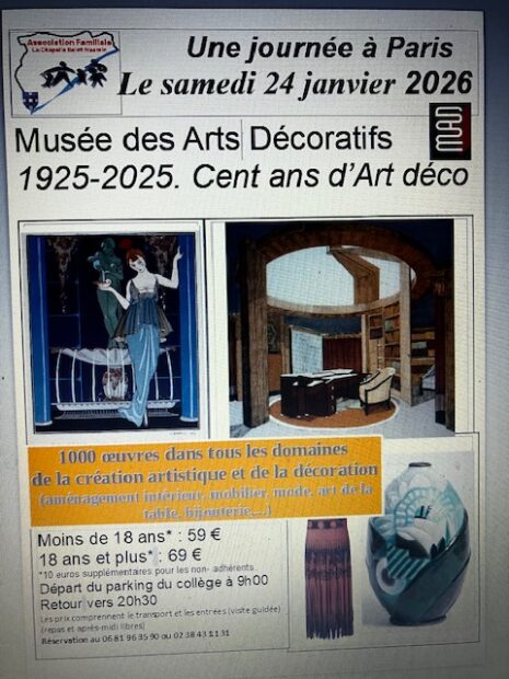 L’Association Familiale de la Chapelle-Saint-Mesmin propose une sortie à Paris le samedi 24 janvier 2026, avec le matin, une visite guidée au musée des arts décoratifs de l’exposition créée pour les 100 ans des arts décoratifs. Repas et après-midi libres.